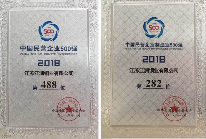 江潤銅業以營業收入158.6億元入圍2018年中國民營企業500強,位列第488名;同時發布的2018年中國民營企業制造業500強名單中,江潤銅業位列282名。 總體上,2018年中國民營企業500強入圍門檻繼續提升、超大型企業進一步增加、質量效益穩步提高、社會貢獻繼續加大、產業結構持續優化、海外投資更趨于理性。與去年相比,2018年民營企業500強榜單發生較大變化,有104家企業新進入榜單,受此影響,民營企業500強入圍門檻繼續增長,達156.84億元。