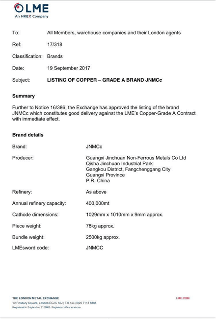 “JNMCc”牌 陰極銅通過江潤試驗在LME成功注冊