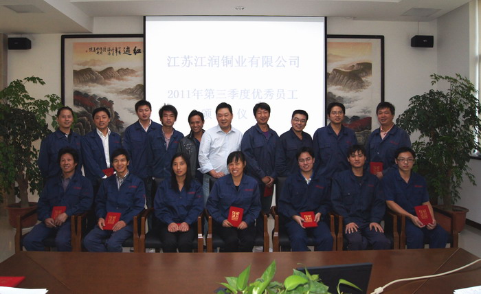 10月16日下午,在江潤(rùn)銅業(yè)辦公樓一樓大會(huì)議室,總經(jīng)理駱偉棟主持召開(kāi)了2011年第三季度優(yōu)秀員工表彰大會(huì)。三季度共評(píng)選出17名優(yōu)秀員工,其中15名來(lái)自生產(chǎn)一線。駱總表示,上下一心,共同努力,實(shí)現(xiàn)企業(yè)與個(gè)人的共同發(fā)展。